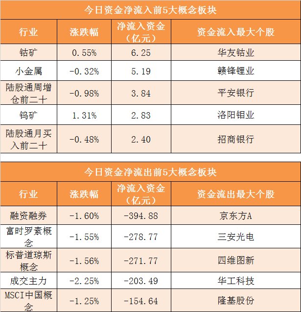 概念板块方面,今日钴矿、小金属、陆股通周增仓前二十、钨矿等概念板块资金呈现净流入,其中钴矿概念净流入6.25亿元居首。