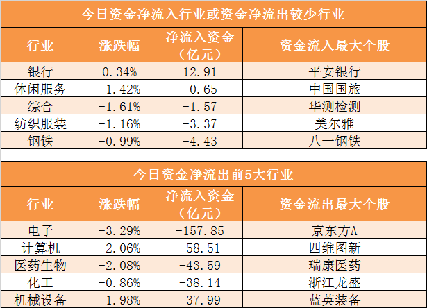 3、电子行业净流出157.85亿元居首
