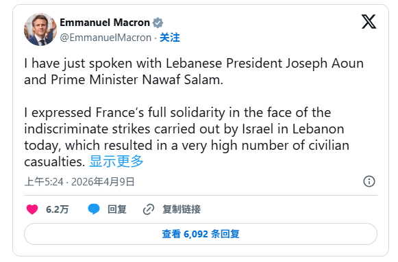 法国总统埃马纽埃尔·马克龙此前表示,黎巴嫩"必须被完全纳入"停火范围。