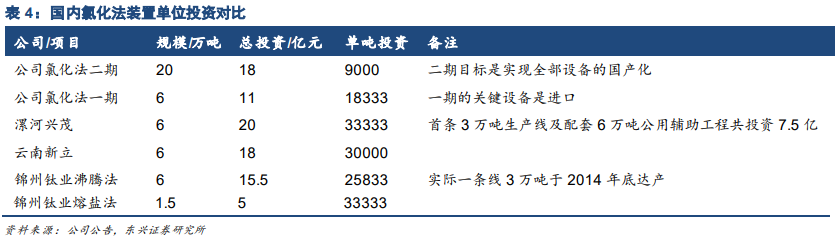 从氯化法技术路线几个方面可以看出来龙蟒佰利的技术优势:1)氯化法产能最为成熟:公司2012年开始与德国钛康合作引入氯化法生产线,2015年2月竣工,但直到9月还未能生产合格产品,后来公司自主研发改进生产线,在16年投产;目前连续运转时间已稳定在20天以上,是国内目前运行最为稳定、续建规模最大的氯化法项目。2)新建产能自主可控:公司氯化法一期项目单吨投资就领先行业,二期项目20万吨产能今年5月份正式启动。二期项目不仅产能是国内氯化法最大的,而且成本更低,公司在一期的沸腾氯化法技术基础上进行多达百余项的工艺革新和改进,确保生产的连续性和稳定性,有效降低生产物料损,单吨投资仅一期项目的一半。