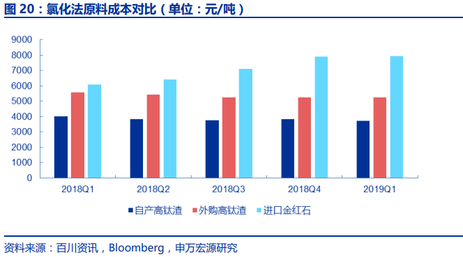 此外,公司未来要大幅增加氯化法产能,早早就开始准备好了上游原料高钛渣的产能建设。今年 4 月龙蟒佰利董事会通过了《关于投资建设 50 万吨攀西钛精矿升级转化氯化钛渣创新工程建设项目的议案》,项目总投资估算为 15.1 亿元,建设周期为两年,建成后将形成年产 30 万吨氯化钛渣、20 万吨高品质铁的生产能力,结合公司在焦作已投产的 30 万吨富钛料冶炼项目,未来公司的氯化法原料有望实现 100%自给。使用自己生产的高钛渣比采购高钛渣平均要便宜1000元/吨,比使用进口的金红石要便宜4000元/吨(金红石这个东西以后基本垄断在三家国外公司手里,涨价的时候下游钛白粉企业不知道会多惨)。