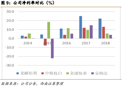 为什么公司的产品价格能比别的公司高呢,因为公司产品出口占比高。公司产品国外市场认可度较高,出口占比接近 50%,且国际市场钛白粉的价格一般高于国内,这个可以从 2017 和 2018 年的公司国内和国外毛利率对比验证。那么,为什么公司产品出口占比高呢,因为技术领先,产品品质好。也因为产品品质好,同样是高端的金红石型钛白粉,中核钛白和安纳达高端产品占比更高,但钛白粉均价反而低于龙蟒佰利。
