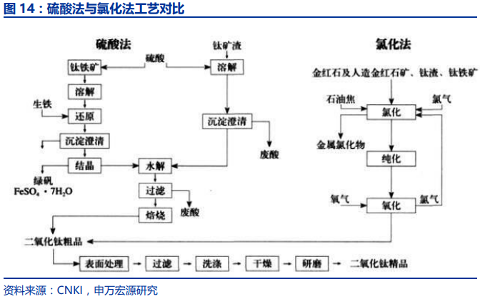 首先我们从氯化法技术说起。大家可能已经注意到,公司接下来要大幅度增加氯化法钛白粉产能,基本不再增加硫酸法的产能。这两种方法有什么区别呢?简单来说,就是氯化法产品质量更优、生产流程更短,易于实现连续化、规模化生产,直接排放的三废大幅低于硫酸法。具体而言,硫酸法生产颜料级钛白粉要经过五大工序:酸解、沉降精滤、水解、煅烧和后处理,实际上需要 20 道左右的工艺步骤,工艺控制点较多;而氯化法仅需经过氯化、氧化和后处理三大工序,工艺流程大大缩短,产品质量容易达到最优的控制,且氯气的循环使用也大大降低了氯化法的废气和废酸排放。目前,海外大型钛白粉生产是已经基本选用氯化法技术来取代了硫酸法,而氯化法钛白粉也基本上占据了全部的高端钛白粉市场份额。