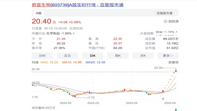 5月以来,蔚蓝生物股价涨势不俗,一度拉出四个涨停板,复权后的股价累计涨幅也达到47%,涨幅居于板块前列。
