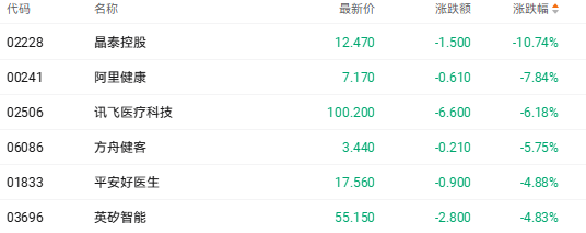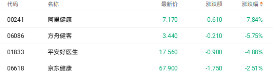 与此同时,互联网医疗股同样表现疲软。截至收盘,方舟健客(06086.HK)跌7.84%、平安好医生(01883.HK)跌5.75%、京东健康(06618.HK)跌2.51%。