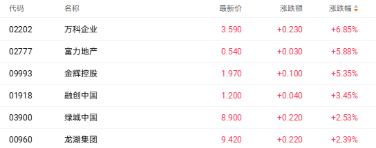 房地产股今日集体走强,截至收盘,万科企业(02202.HK)涨6.85%、富力地产(02777.HK)涨5.88%、融信中国(03301.HK)涨3.45%。