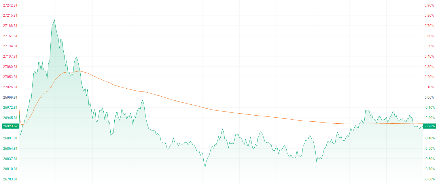 港股三大指数集体调整。截至收盘,恒生指数跌0.28%,报26923.62点;恒生科技指数跌1.35%,报5828.35点;国企指数跌0.52%,报9266.86点。
