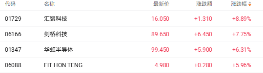 光通讯概念股今日全线走强,截至收盘,汇聚科技(01729.HK)涨8.89%、剑桥科技(06166.HK)涨7.75%、华虹半导体(01347.HK)涨6.31%。