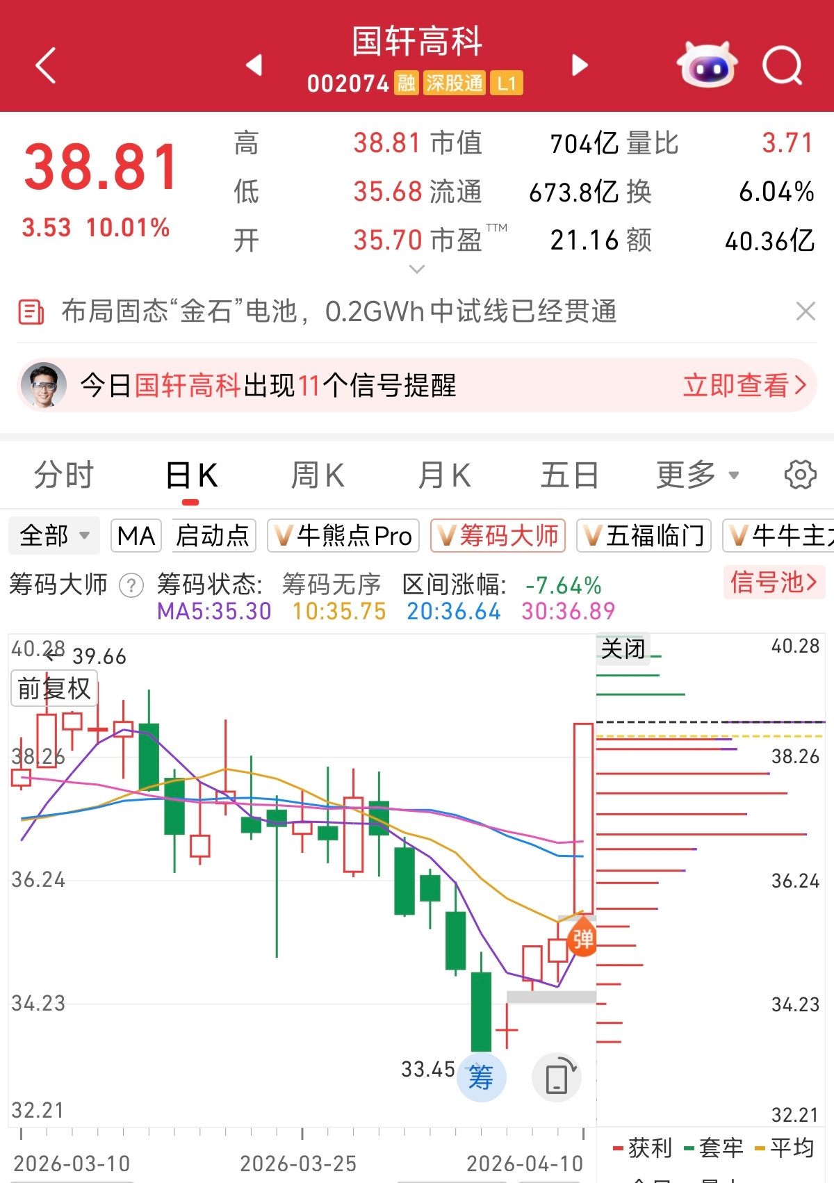 根据筹码大师监控,今日大涨的国轩高科,在4月10日出现筹码强支撑信号,感兴趣的朋友可以自行跟踪判断。