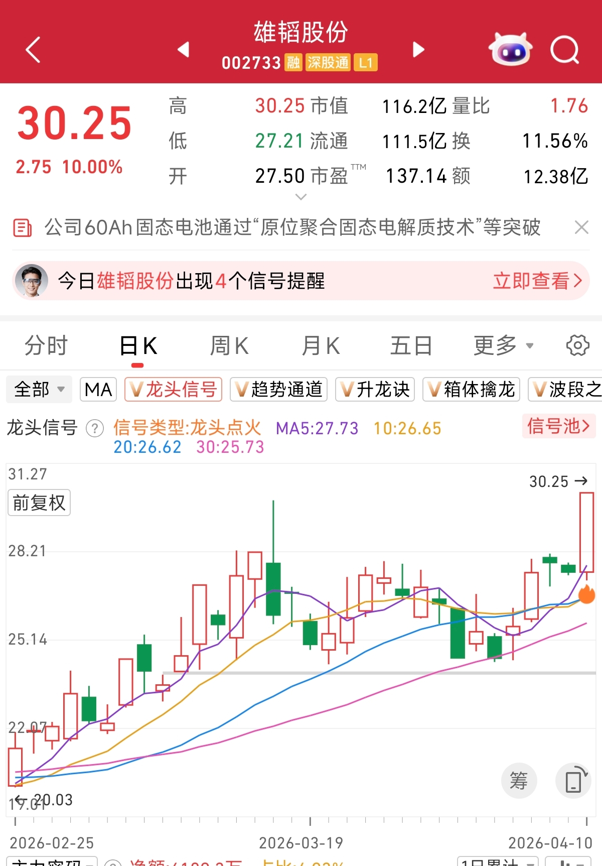 根据龙头信号监控,近日大涨的雄韬股份,在4月10日出现龙头点火信号,感兴趣的朋友可以自行跟踪判断。