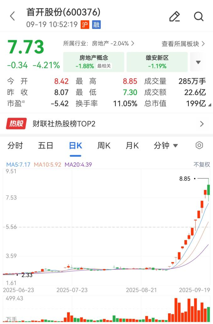 在12个交易日拿下11个涨停板后,9月19日早盘,房企首开股份股价出现大幅震荡,从高开并触及8.85元/股后又直线跳水,一度逼近跌停。截至发稿,该股跌幅缩窄至4%附近,报7.73元/股。而首开股份股价大起大落的背后,正是参股了智能机器人公司——宇树科技。