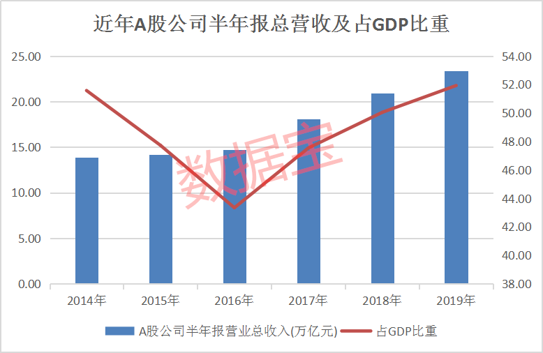 证券时报·数据宝统计显示,不含今年下半年上市的公司,A股半年度营收23.41万亿,与上半年中国GDP总量45.1万亿相比,占到51.9%,营收和净利润分别同比增长9.32%、6.54%,扣非净利润同比增长6.04%,整体销售毛利率19.4%,基本保持稳定。