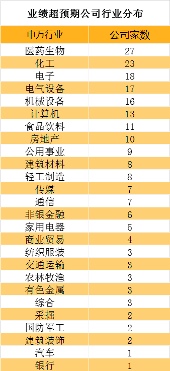 由于行业景气度上升、业务转型、减税降费效应加速显现、公司经营效率提升等积极因素影响,部分上市公司上半年业绩超预期增长。数据宝统计显示,结合券商研报及上市公司业绩预告数据对比来看,不含年内上市的次新股,上半年实现盈利且同比增长,业绩超预期的公司共计212家,这些公司主要集中在医药生物、化工、电子、电气设备、机械设备等行业。