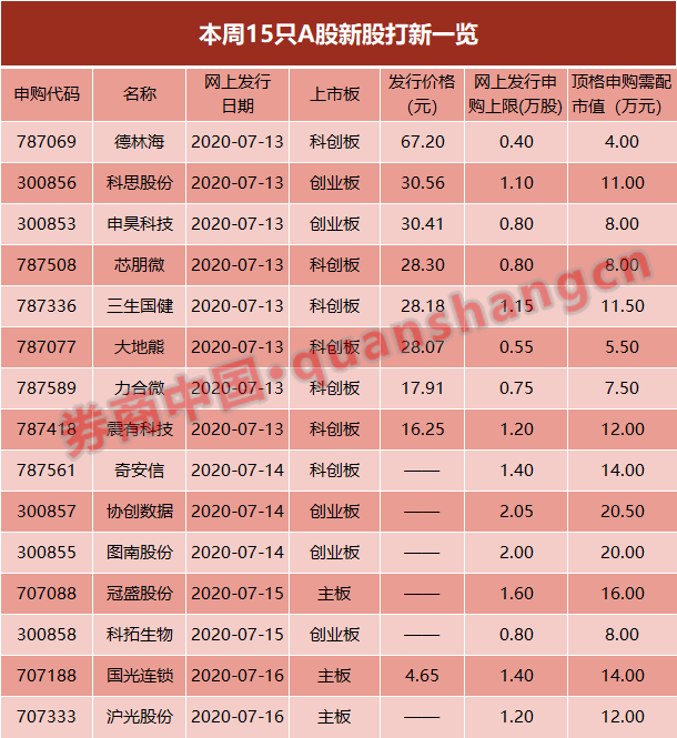 7月13日(周一),15只新股进行网上发行,包括2只创业板新股科思股份、申昊科技,6只科创板新股大地熊、力合微、震有科技、芯朋微、德林海、三生国健,以及7只新三板个股恒拓开源等。