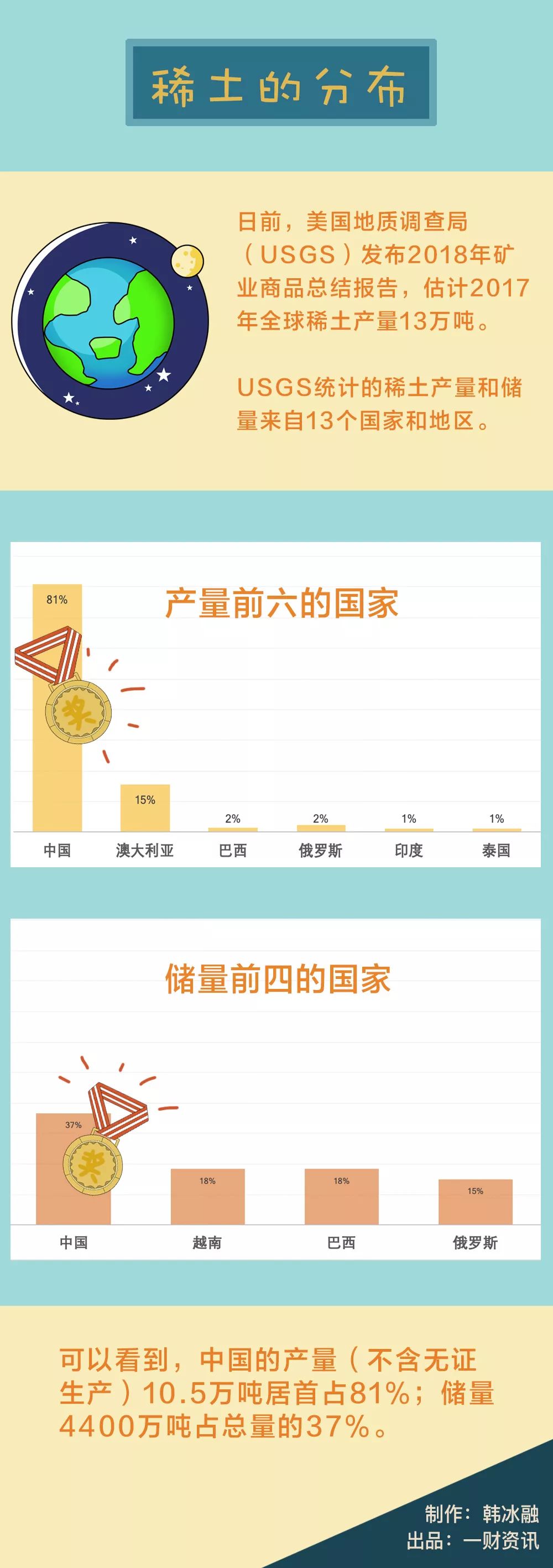 美国地质调查局(USGS)发布2018年矿业商品总结报告显示,估计2017年全球稀土(REO)产量13万吨,仅比2016年增加1000吨。中国、越南、巴西、俄罗斯稀土储量居前并占总量1.2亿吨的89%。USGS统计的稀土产量和储量来自13个国家和地区,中国的产量(不含无证生产)10.5万吨居首占81%;储量4400万吨占总量的37%。