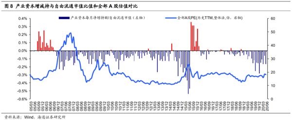 以史为鉴,市场底部附近产业资本表现为净增持。产业资本的大量增持使得乐观的投资者认为这是市场见底的信号。从历史产业资本净增持额角度看,除15/07-16/01异常波动期间外,05年以来产业资本在05/06-06/09、10/05、14/04-14/05、16/11、17/05-17/08、18/02期间表现为净增持,其对应的上证综指基本处于阶段性底部,其对应的全部A股PE(历史TTM,整体法)最低分别到达18.8、20.2、11.7、22.4、20.2、18倍,均为阶段性低点。总体上,历史数据显示产业资本净增持是市场见底的信号,而产业资本增持的动因是估值处在相对较低水平,长期看公司估值将回归历史均值附近,从而在增持后公司股价走势向好。总体来看产业资本的入场为市场注入增量资金,阶段性市场底部基本确立,利好股市未来走势。