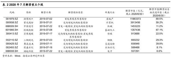 20年7月A股解禁市值约为3092亿元,较20年6月上升。按照2020/6/30的股价估算,20年7月A股解禁市值约为3092亿元,高于20年6月的1936亿元,20年月均解禁2923亿元。20年月均解禁2923.49亿元,19年月均2629.07亿元。20年7月解禁市值/自由流通A股市值为1.13%,2017年以来该比值均值为1.17%;20年7月解禁市值/成交金额为2.14%,2017年以来该比值均值为2.83%,从自由流通市值角度20年7月解禁相对规模低于2017年以来平均水平。从板块看,20年7月主板、中小板、创业板解禁金额分别为2011.26、345.12、735.96亿元,解禁金额/自由流通A股市值分别为1.13%、0.66%、1.87%,解禁金额/成交金额分别为2.86%、0.90%、2.39%。对全部A股每年解禁市值进行统计,基本稳定在每年3万亿元左右,20年/19年/18年全部A股解禁市值分别为35082亿元、31549亿元和31376亿元。