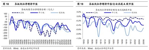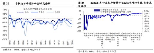 20年6月A股公告拟净减持市值约为653亿元,高于20年5月的593亿元,17年6月(减持新规实施)以来月均公告拟净减持327亿元。2017年5月发布的减持新规要求产业资本在正式实施增减持之前需提前发布公告,一般情况下增减持计划的实施区间在6个月左右,通过分析公告拟减持金额可以对产业资本未来的增减持意愿进行大致度量。我们对6月份公告的产业资本拟增减持进行统计,按照2020/5/31的股价估算:20年6月拟净增减持额/自由流通A股市值为-0.24%,2017年6月以来该比值均值为-0.15%;20年6月拟净增减持额/成交金额为-0.45%,2017年6月以来该比值均值为-0.33%,从自由流通市值角度20年6月拟净减持额相对规模高于2017年6月以来平均水平。从板块看,20年6月主板、中小板、创业板拟净减持额分别为228.44、214.28、209.89亿元,拟净增减持额/自由流通市值分别为-0.13%、-0.41%、-0.53%。