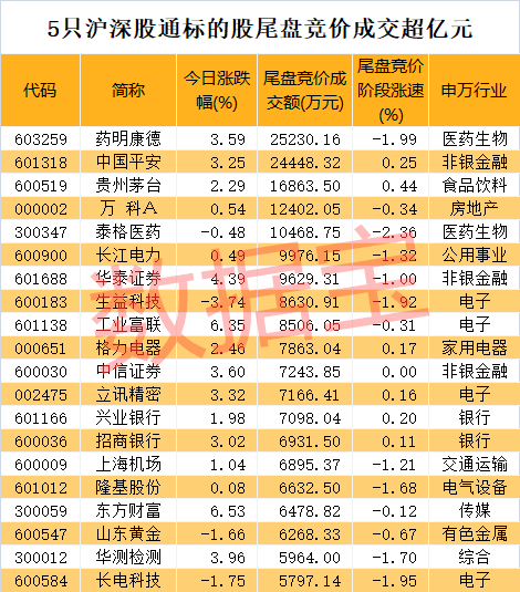 207股尾盘集合竞价阶段成交金额超过千万,药明康德、中国平安、贵州茅台、万科A、泰格医药成交金额均超过亿元。药明康德竞价成交金额2.52亿元排在首位,该股尾盘竞价阶段被巨量资金砸盘,股价三分钟内下跌1.99%。药明康德为全球CRO/CMO龙头,从其历史走势来看,该股当期股价处于历史高点附近。另一只医药股泰格医药竞价成交金额1.05亿元,该股尾盘三分钟内股价下跌2.36%。公司为高成长性CRO龙头,当期股价也处于历史高点附近。