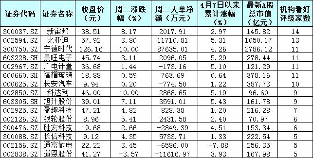 《证券日报》记者进一步梳理发现,4月7日以来截至4月14日,特斯拉概念板块整体市值增长404.93亿元,其中,85只成份股期间实现不同程度的上涨,宁德时代、比亚迪(002594)、金发科技(600143)、三花智控、中信国安(000839)、拓普集团、景旺电子(603228)、奥特佳、华工科技(000988)、天齐锂业等10只个股期间总市值增长均在11亿元以上。
