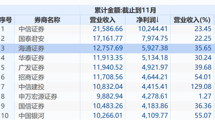 整体而言,前11月,上市券商累计实现营业收入合计2154.81亿元,累计净利润合计800.91亿元,累计同比分别增长35.04%、48.95%。其中,中信证券、国泰君安、海通证券累计净利位居前三,分别为102.44亿元、79.7亿元、59.27亿元。