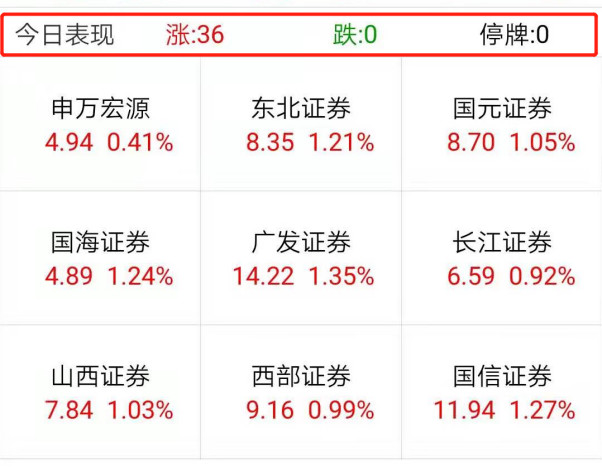 截至当日收盘,超2万亿的券商板块单日市值激增超480亿元,券商B指数大涨超3%,36家上市券商全线上涨,无一下跌。