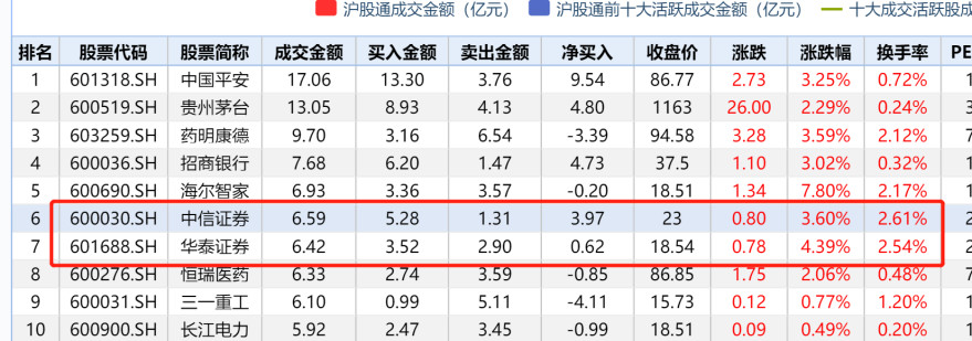 而从北上资金活跃买入的个股看,其资金布局方向也从原本的银行、消费等蓝筹股转为科技、券商等方向个股。从最新公布的北上资金十大活跃股列表看,近期北上资金对龙头股中信证券、华泰证券的成交金额均超6亿,换手率也高达2%以上。