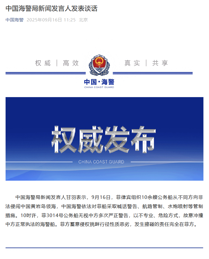 9月16日讯,中国海警局新闻发言人甘羽表示,9月16日,菲律宾组织10余艘公务船从不同方向非法侵闯中国黄岩岛领海,中国海警依法对菲船采取喊话警告、航路管制、水炮喷射等管制措施。10时许,菲3014号公务船无视中方多次严正警告,以不专业、危险方式,故意冲撞中方正常执法的海警船。菲方蓄意侵权挑衅行径性质恶劣,发生擦碰的责任完全在菲方。