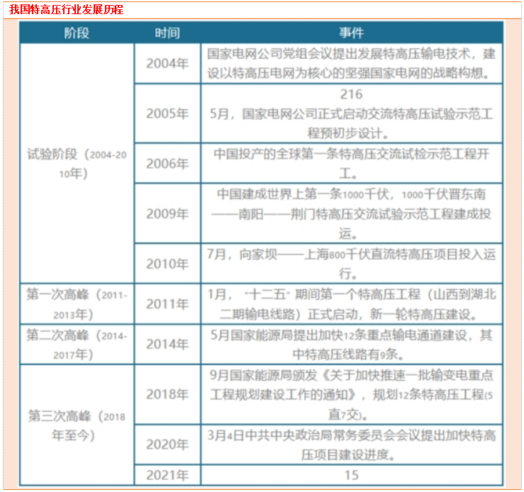 2009年1月,我国首条特高压线路开始投运,行业试验阶段逐渐成熟;2010年新一轮特高压又开始建设,随后我国特高压行业发展进入第一次高峰;2014年国家能源局提出加快12条重点输电通道建设,行业发展开始进入第二次高峰。