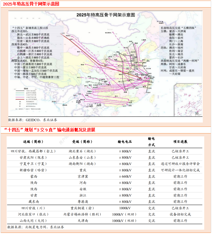 综上,在大型风光基地项目建设并网工作稳步推进的背景下,基于国家能源局及国网的规划,为了服务好沙漠、戈壁、荒漠大型风电光伏基地建设,支撑和促进大型电源基地集约化开发、远距离外送,特高压建设有望持续推进。