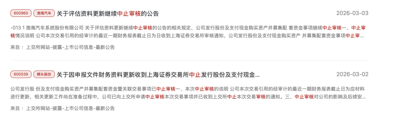 因申报文件时效问题触发中止审核的案例是极为普遍的,一般最密集的时段集中在每年1—3月,尤其是2—3月为高峰,核心原因是年报审计周期与财务、估值资料有效期。交易所官网所示,2025年以来,与湘财股份情况相同的程序性中止案例超过50个,2026年以来就有15单,例如渤海汽车、狮头股份、华懋科技等。