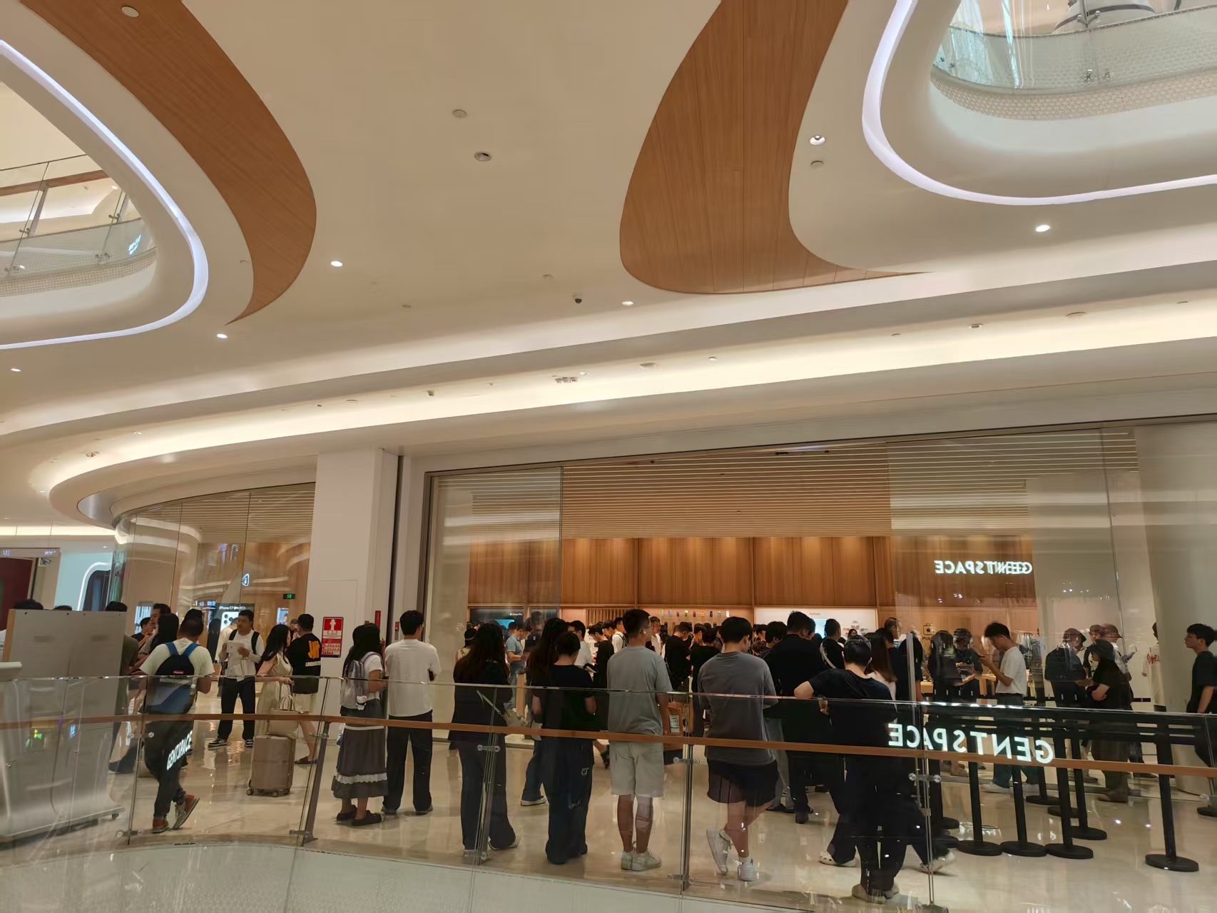 上午11点左右,记者在深圳前海壹方城看到,商城人流不多,但苹果旗舰店人流涌动。苹果旗舰店门口有大约70个人在排队提货,店内还有近100名消费者在挑选产品,门外有几个黄牛提着苹果的白色袋子。11点左右的上海静安寺广场苹果旗舰店,前来取货的消费者也已排上了长队,据记者粗略估算,约有50个左右的顾客在排队。