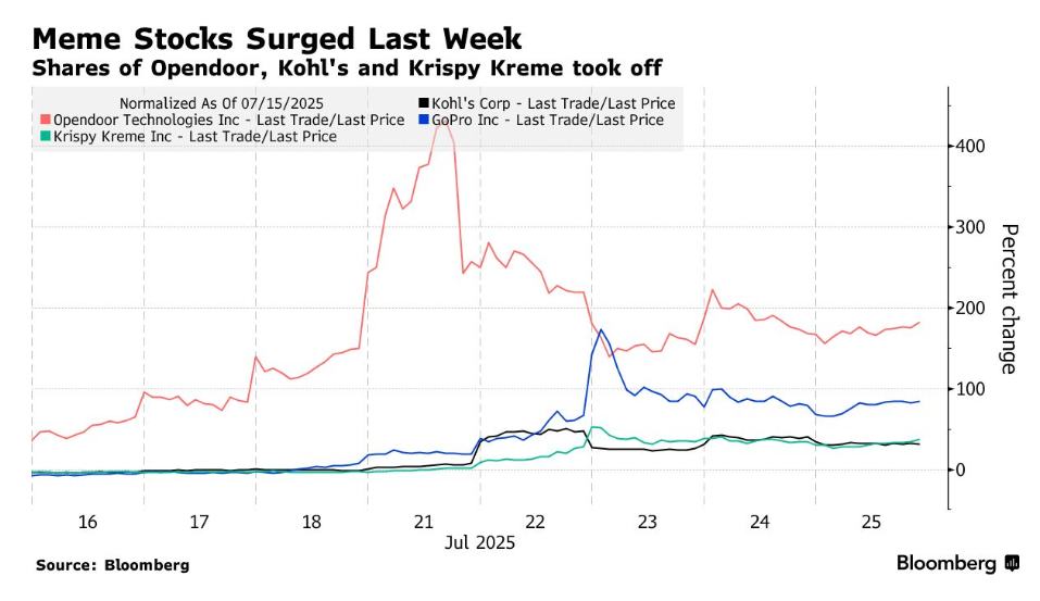 本周陷入投机狂潮的股票,如Opendoor Technologies Inc.(OPEN.US)和柯尔百货(KSS.US),虽在周中回吐部分涨幅,但多数仍维持在数月高位。标普500指数和纳斯达克100指数表现更为亮眼,自4月初因特朗普政府宣布关税引发抛售后,已强势回升并创下历史新高。