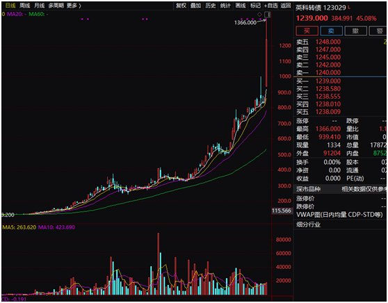 已成为市场上最贵可转债的英科转债再次暴涨45.08%,盘中一度达1366元,该可转债于去年9月挂牌上市,目前上市仅10个月时间,但今日最高价格已较发行价飙涨12倍之多。