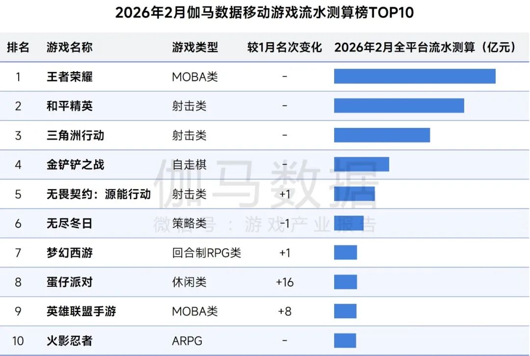 2026年2月伽马数据移动游戏流水测算榜TOP10中,头部固化与中后段激烈竞争并存,TOP4产品排名不变,《蛋仔派对》《英雄联盟手游》排名上升明显。