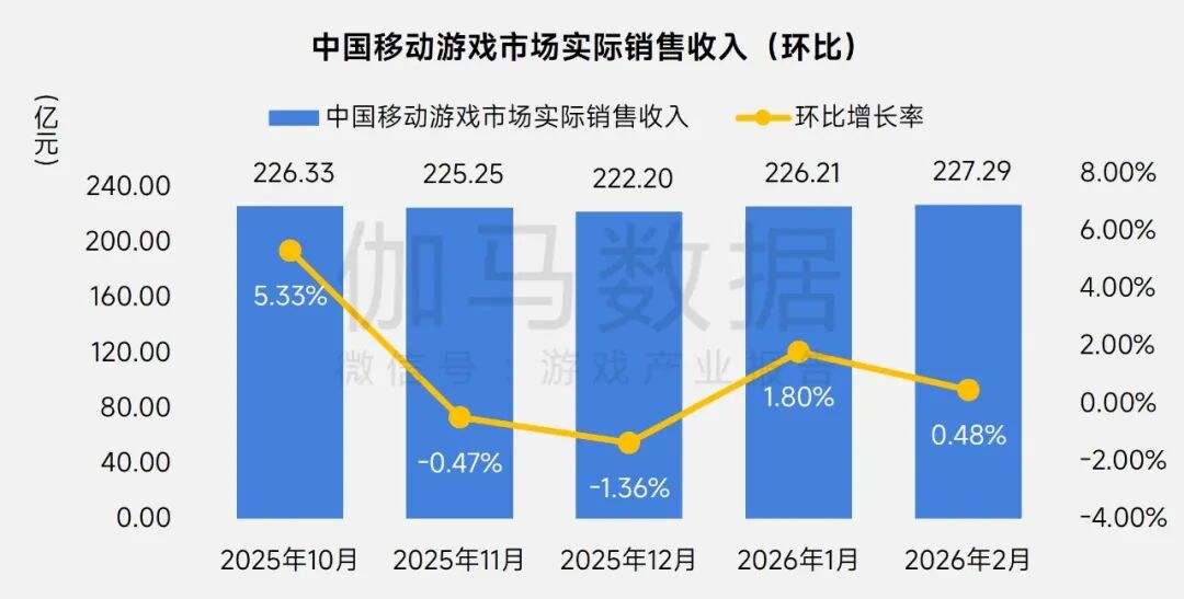 2026年2月,中国移动游戏市场实际销售收入达到227.29亿元,环比增长0.48%,同比增长9.05%。环比层面,市场增长动能主要来自长线产品的春节档期运营活动:《和平精英》《三角洲行动》《蛋仔派对》等通过版本更新与限定活动有效拉动了用户付费;但本月新上线游戏整体表现平淡,未能提供有效增量,同时头部产品《王者荣耀》本月情人节活动虽带动日流水创近一年新高,但受上月流水基数较高影响,本月流水仍呈下滑,《明日方舟:终末地》作为上月新游,本月流水自然回落,多重因素制约了环比增长幅度。同比层面,增速转正,主要因今年春节假期完整处于2月,假期用户活跃度与付费集中释放。