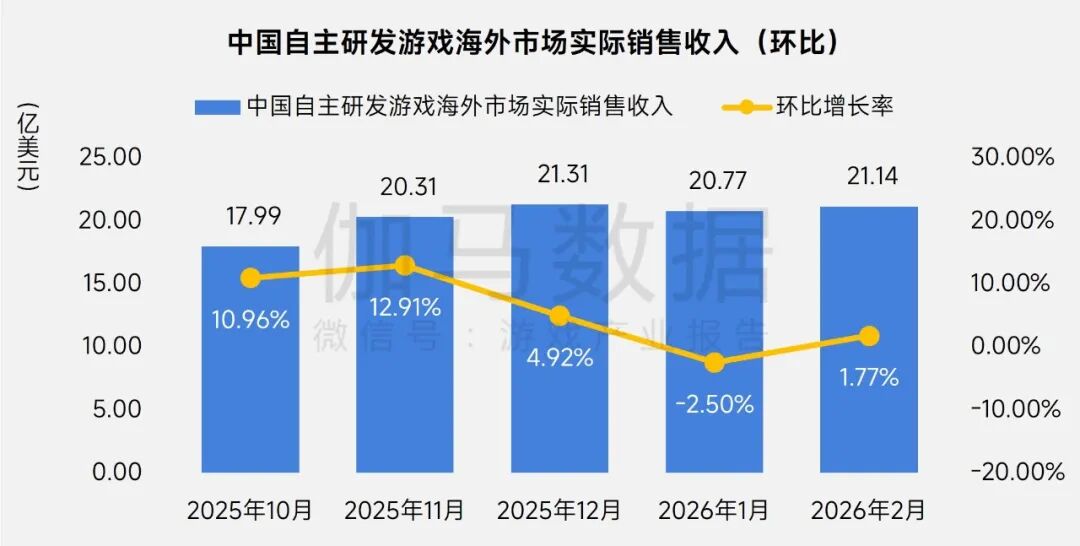 2026年2月,中国自主研发游戏在海外市场的实际销售收入达到21.14亿美元,环比增长1.77%,同比增长40.46%。环比方面,《鸣潮》《心动小镇》《崩坏:星穹铁道》为市场提供了增量;同比方面,《Kingshot》《浪漫餐厅(Gossip Harbor)》《Last Z: Survival Shooter》等产品驱动增长。