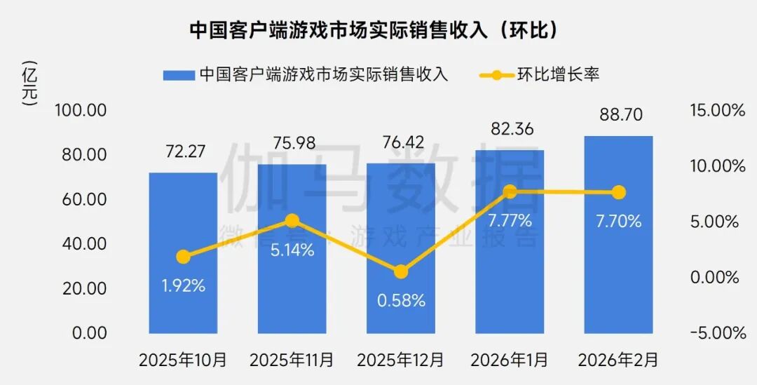 2026年2月,中国客户端游戏市场实际销售收入达88.7亿元,环比增长7.7%,同比增长56.75%。环比增长主要得益于春节档期用户活跃度增加,以及重点产品的版本内容更新。同比呈现较大幅度增长,核心驱动力来自双端互通产品,其中《三角洲行动》市场增量贡献超7亿元,游戏在2月中上旬上线角色、皮肤特别活动,带动用户付费意愿增加。