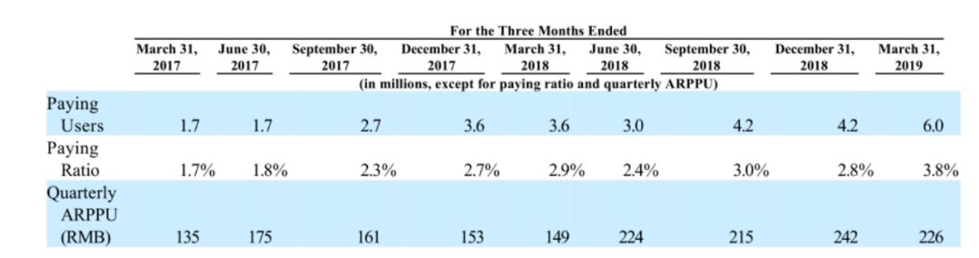 每付费用户平均收益(ARPPU)值为226元,较上年同期增长51.7%;用户平均付费率有3.8%,较上年同期增长66.7%。