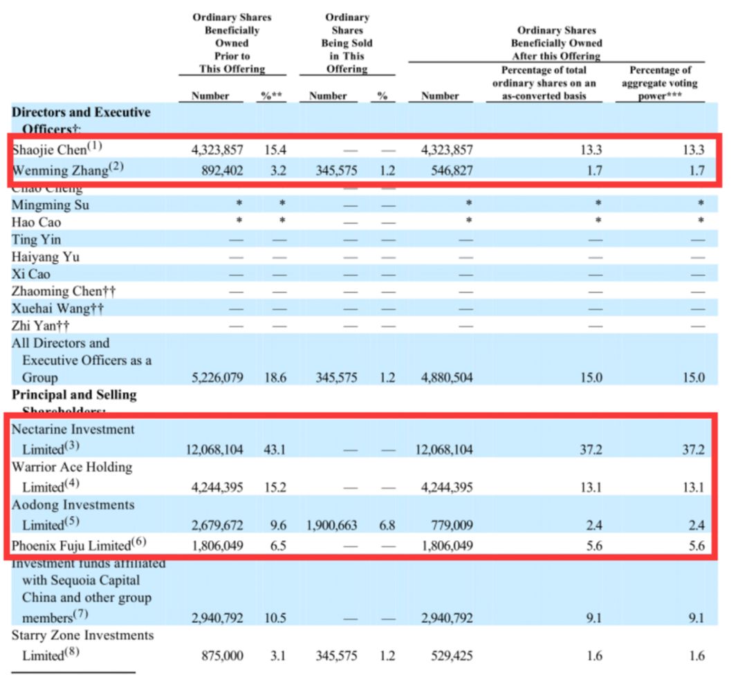 蔡东青持股为2.4%,Phoenix Fuju Limited持股为5.6%,红杉资本及其他机构成员持股为9.1%。