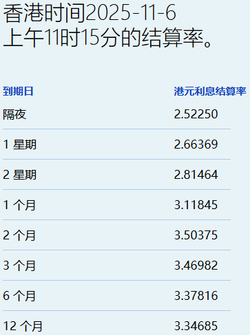 11月6日,港元拆息普遍向下,而与楼按相关的一个月拆息连跌四日,报3.11845%,跌4.286基点;反映银行资金成本的三个月拆息报3.46982%,升1.696基点。