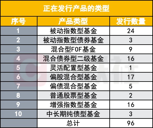 回到具体数据层面,本轮年末新发首先体现在数量和节奏的“双抬升”。按照统计,目前正在发行的公募基金合计96只,偏股混合、指数、FOF与债券产品均在其中,占比结构相对均衡。