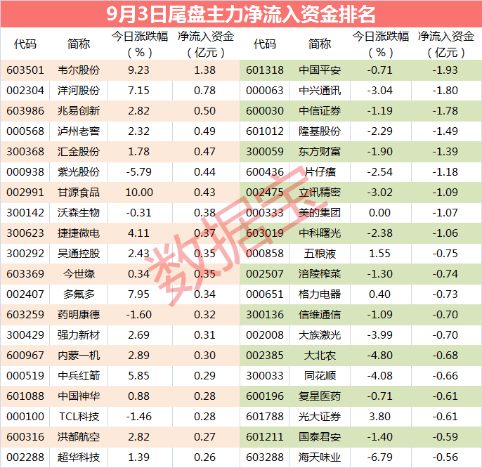 从个股尾盘资金流向数据看,仅1股尾盘净流入资金超亿元,韦尔股份、洋河股份、兆易创新等个股尾盘资金净流入金额最多,分别高达1.38亿元、0.78亿元和0.5亿元;中国平安、中兴通讯、中信证券等个股尾盘资金净流出金额最多。