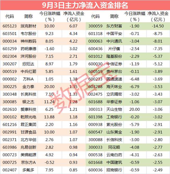 主力资金净流出个股中,东方财富主力资金净流出14.5亿元,净流出资金最多;其次是中国平安、中兴通讯、片仔癀,净流出资金分别为8.75亿元、8.01亿元、7.35亿元。