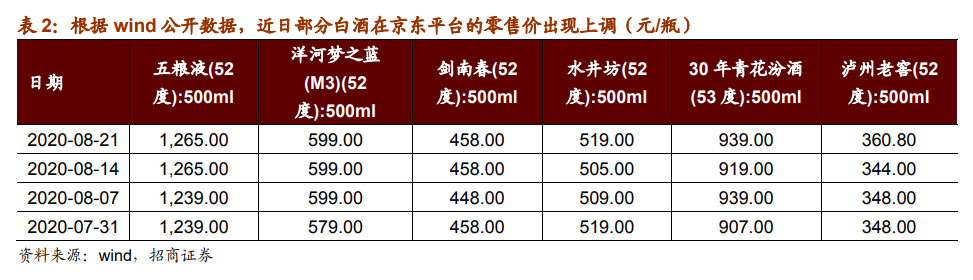 双节来临需求提升,白酒价格重心有望上移。二季度白酒行业经历了库存消化之后,销售端呈现逐月改善的趋势。近期部分白酒价格重心上移。国庆和中秋双节临近将明显提升白酒的消费需求。