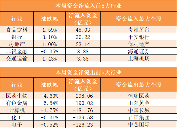 28个申万一级行业中,本周5个行业实现资金净流入,其中食品饮料行业净流入45.03亿元居首。