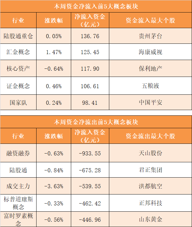 概念板块方面,本周陆股通重仓、汇金概念、核心资产、证金概念等概念板块资金呈现净流入,其中陆股通重仓概念净流入136.76亿元居首。