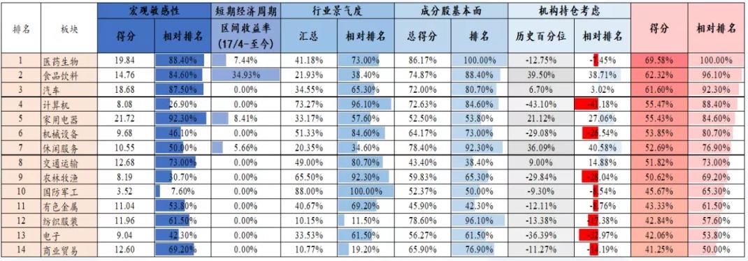 从行业的配置来看,我们首先基于五个维度给出了行业排名。