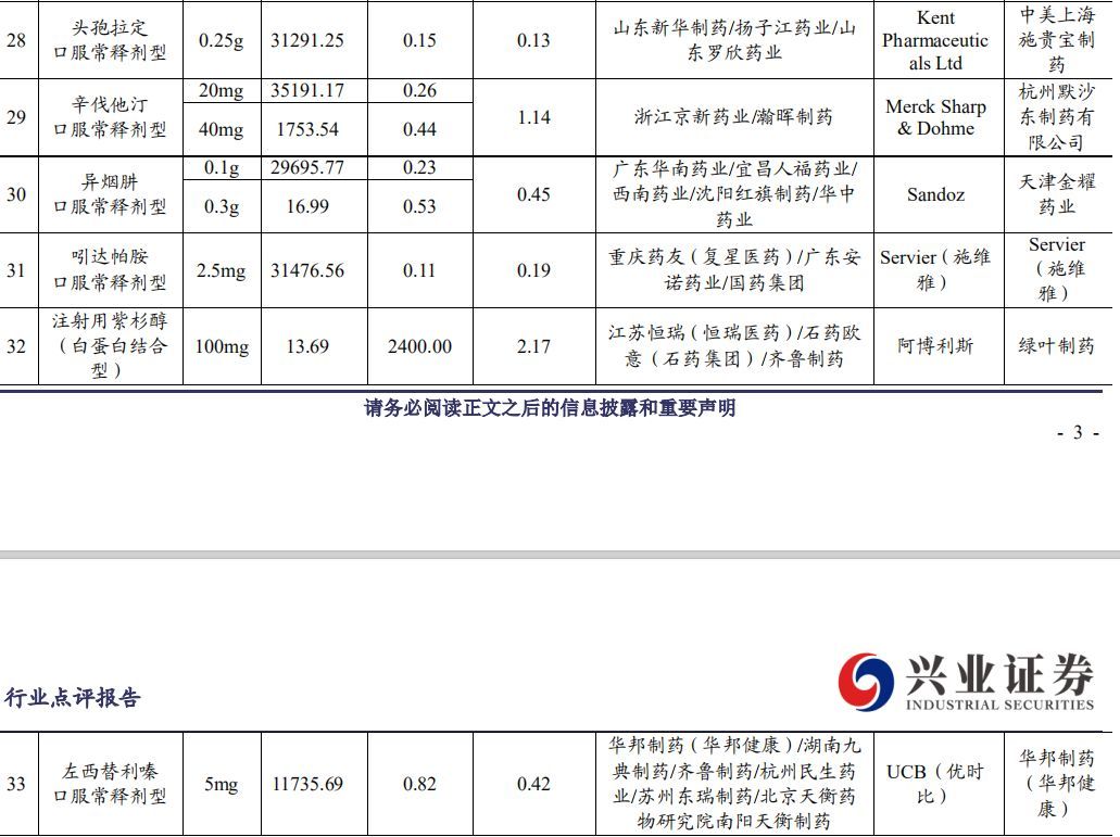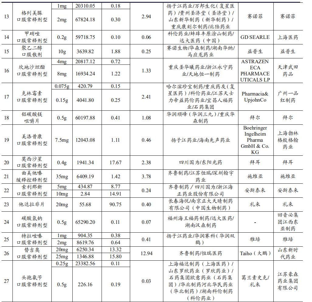依据公开资料,阿莫西林符合申报企业数量组最多,达8家,包括联邦制药、石药中诺、湖南科伦、金华康恩贝、安科恒益、鲁抗医药、桂林南药、湖南先声;格列美脲、莫西沙星、左西替利嗪紧随其后,达7家,按照规则这些品种最多入围企业数量可达5家。综合来看,符合申报企业数量多在3家左右,预计竞争场面仍旧激烈。