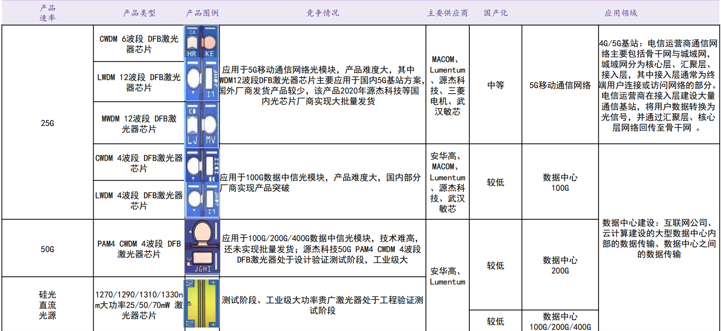 25G激光器芯片主要应用于5G移动通信网络,50G光芯片主要应用于数据中心。主要供应厂商有MACOM、Lumentum、武汉敏芯、三菱电机、安高华等。